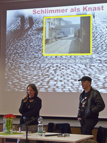 Ein Vorteil für mich war: Solange Stefan dabei war, gab es meist keine Disziplinschwierigkeiten – selbst, wenn 200, 300 oder sogar mehr pubertierende Schülerinnen und Schüler vor uns saßen, da die Schulen manchmal eine Stadthalle gemietet hatten. Im Gegenteil, es war meist mucksmäuschenstill, oft dauerten die Veranstaltungen viel länger als geplant, da die Jugendlichen so viele Fragen hatten. Stefan war fast immer mit schwarzem Rammstein-Shirt, olivgrüner Cargohose und Käppi bekleidet. Als Anschauungsmaterial zum Geschlossenen Jugendwerkhof brachte er Gummiknüppel, Handschellen und Knebelkette mit. Dass er gar nicht so hart war, wie er da tat, wusste nur ich.