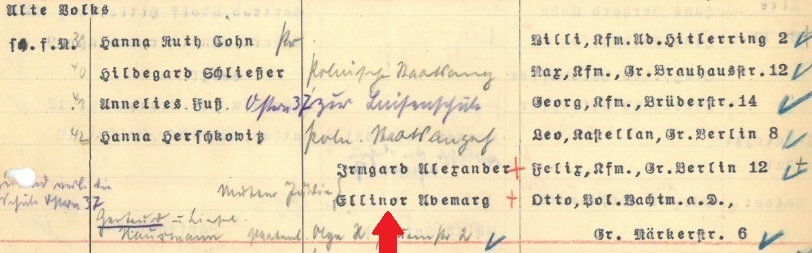 Ellinor war auf der Neumarktschule eingeschult worden. Ein Foto zeigt sie zur Einschulung am 13.4.1934. Zum gleichen Zeitpunkt wurde dort auch Wolfgang Brühl eingeschult (-> Stolperstein Alter Markt 12). Mit dem Umzug in die Große Märkerstraße 6 im Jahr 1935 ging ein Schulwechsel zur Alten Volksschule am Waisenhausring einher (heute Berufsbildende Schulen IV Halle „Friedrich List).