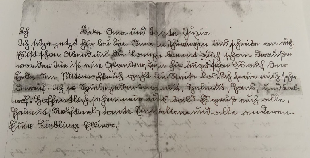 - Brief von Ellinor an die Oma in Brüssel, Dezember 1938: Liebe Oma und Tante Guzia (Gertrud) ich sitze jetzt hier bei der Oma in Thüringen und schreibe an euch. Es ist schon Abend und die Lampe brennt auch schon. Draußen vor der Tür ist eine Glander, denn hier liegt schon Eis auf der Erde. Mittwochfrüh geht die Reise los. Ich freue mich sehr darauf. Ich spiele jeden Tag mit Helmut, Hans und Karl-Rolf. Hoffentlich sehen wir uns bald. Es grüßen euch alle, Rolfkarl, Helmut, Tante Emeline und alle anderen. Euer Liebling Ellinor.