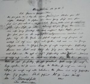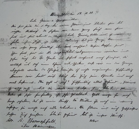 - Brief von Otto Avemarg an Schwägerin und Schwiegermutter in Brüssel: Obermaßfeld, den 17.12.38. Liebe Guzia (Gertrud) und Schwiegermutter. Wir sind heute den 1. Tag bei meinen Eltern und bleiben hier bis nächsten Mittwoch, da fahren wir dann ganz früh von hier und sind abends in Aachen. Liebe Guzia, Vella und ich wir haben unsere Pässe, ist alles in Ordnung. Bis zur Grenze kommen wir also ganz friedlich, aber was nachher? Unsere Koffer sind schon fort, sind in H(alle) anstandslos abgenommen worden und gehen durch bis Br(üssel). Schreibe uns sofort nochmal nach hierher, du wolltest uns doch einen Schein mit schicken, daß wir an der Grenze abgeholt werden. Die Schlüssel brauchte ich nicht anzumachen. Hoffentlich können wir bald auf Besuch bei Euch sein. Schreibe uns noch mal bestimmt. Wie geht es euch? Hoffentlich alles gesund. Ellinor ist auch recht mobil, die würde am liebsten hier bleiben. Mein Vater ist sehr hinfällig, ist sehr gealtert. Gott möge ihn noch lange erhalten, das ist mein Wunsch. Die Mutter ist noch ein wenig rüstiger, sie macht noch alle Arbeiten. Die Eltern und auch Geschwister lassen Euch grüßen. Bleibt gesund das ist unser Wunsch. Adresse ist: Obermaßfeld, über Meiningen. Otto (Anmerkung: Otto Avemargs Vater verstarb zwei Tage nach diesem Brief, jedoch noch vor Abreise der Familie nach Belgien)