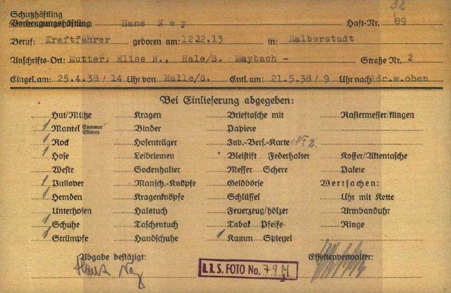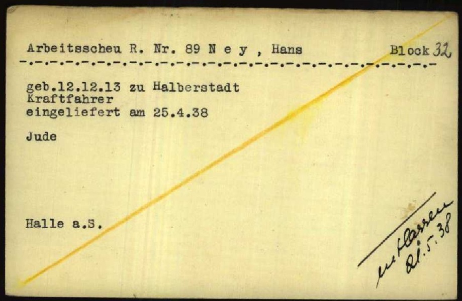 Im April 1938 wurde der 24-jährige Hans Ney im Zuge der Aktion „Arbeitsscheu Reich“ von der Kriminalpolizei in Halle verhaftet.